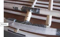 The final frame was 16-1/2 feet long and 3 feet wide but used the same construction ideas as the single seat boat. The additional features were the cockpit frame and decking. The cockpit used a new type of attachment bracket shown below.