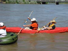 On May 24th we took the frame down to the Rio Grande, skinned it with 4 mil plastic, and put it in the water to test the basic design. It floated reasonably well, but we did notice two things that needed improvement. The forward seat needed a backrest and the bottom stringers needed a different method of attachment, especially in the areas where we would be stepping. The duct tape-bracket combination did not perform well under tension.