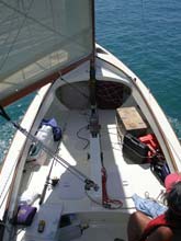 It was a quiet day on the water, and as the clouds burnt off, we baked in the sun and tried to sit in the shadow of the sail. I trailed a spinner out behind, hoping to pick up a fish for our dinner. In the early afternoon the wind dropped right off again so Barb got out our lunch of chicken legs and salad. When we finished eating we were surprised to find a small hammerhead shark cruising around the boat which cleaned up the bones as we dropped them over the side. It was about 4 foot long and was the first of 7 of these that we spotted during the day.