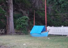 In the late afternoon we crossed back to Scotts Landing where a large marquee had been erected near the beach for the Saturday night prizegiving and party. The Te Haupa Trophy was taken out by Peter Sewell in his beautiful Norse inspired faering 'Silver Tern'. The organisers provided hamburgers for dinner, and a much needed cold beer after another long hot day. Later on the Prohibition Big Band started up, and the party was soon in full swing. We pushed offshore a hundred metres or so later on and got ready for another night aboard, and we very entertained by the drunken antics of the many dinghy loads of partygoers returning to their boats further out in the bay as the evening wound down. It had been quite a day.