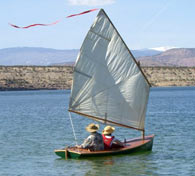 I finished mine in the style of a Melonseed. She sails great, can fit 2 adults in a pinch. I intended her for teaching the kids to sail in. The sail rig has 3 - 8 foot cedar spars that are light and stow inside the cockpit and under the deck, enabling it to be rowed comfortably.