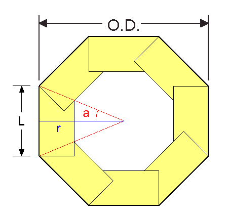 The angle value of a, shown in Figure 3, is 180 degrees divided by the number of sides N. For an 8-sided polygon, that angle value is 22.5 degrees. For a 6-sided polygon, the angle value is 30 degrees. The outside diameter ( O.D. ) being twice the radius, the formula we are looking for is: