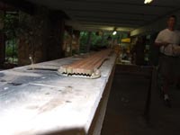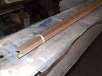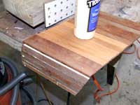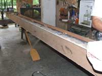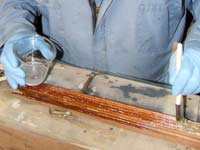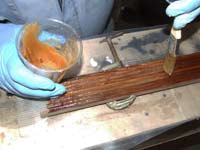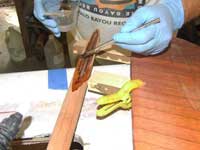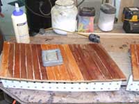 | Lightly reclamp strips together v-groves up and mix epoxy. First spread a coat of neat epoxy in grooves followed by epoxy thickened with wood flour to the consistency of thick syrup. |