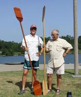 The picture on the left shows Jeff Jouett with his new two pound mahogany double blade with s.s. ferrule from Duckworks next to yours truly and my old pound and a half double blade made from Quam, a Central American wood with a density somewhere between Western Red Cedar and Balsa. The paddle may be light but it’s tough enough to have seen me through close to a thousand river/creek miles so far and the paddle’s probably in better shape than the paddler.