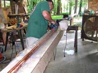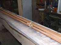 | However the v-grove is done, then rip the strips to 9/16” wide, this will finish out to a shaft 1-3/8” diameter, so if you want a thinner shaft go maybe 1/32” narrower, a little bit goes a long ways here. The next step requires a seven to eight foot long flat space, a good 2x4 or 2x6 will work. Clamp all eight strips together, v-groves down getting strips aligned as best you can. Taper both ends down to 5/16” or a little less, leaving the middle 32” or so parallel, a power plane is handy here. Then lightly sand planed area to open the grain. |
