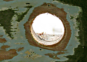 There are two problems with the design, though. First, the holes are only about 1” in diameter—any larger would invite the waves to break right in. Second, when there are lots of cockpit-sitting passengers and a full gas tank, the water level approaches the floor level and, on windy days the water comes in on the floor to a disturbing degree even though with the two outer floats/hulls there is no chance of swamping.