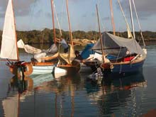 Summertime in New Zealand is cruising time, to be sure, but it’s also regatta time, with several major events held in cities as diverse as Wellington, Nelson, and Auckland. On the anniversary of Auckland’s founding, boats gather at Scott’s Landing for the Mahurangi Classic Boat Regatta. In 2006, 14 Welsford cruising dinghies lined up at the beach in front of the regatta committee’s headquarters. Among them, Jaunty, a 14-ft Navigator owned by Dave Perillo. Light-blue Jaunty is Dave’s second Navigator. His first one, Margaret H, was left behind in Fiji, where Dave cruised her for 10 months.