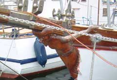 | Sinbad was the boat's name, the namesake 'figurehead' a little undignified wearing the masking tape of a partly completed refinishing job. |