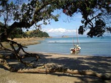| It was another perfect sunny day, and once again we anchored ‘fore and aft’ and went ashore for a brew up in the shade of one of the overhanging Pohutukawa trees. |