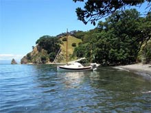The following day was the 31st December, and over a leisurely late breakfast we discussed where we would like to be to see in the New Year. Having decided we needed more company than just our own on New Years Eve, and with the rubbish bag full, the fresh food finished and needing water, we looked out across the Firth of Thames to the Coromandel Peninsular 12 miles away, and the decision was made. Te Kouma harbour was bound to be full of boats and nearby Coromandel town would be open for business on New Years day, being a tourist mecca. There was the added attraction that it was all new territory for us. We set off about midday, hopeful that the forecast winds of 10 knots, rising to 15 later would eventuate. Unfortunately they didn’t. We motored most of the way across, baking in the sun, stopping to fish several times and sailing when the gentle breeze rose a little from time to time. We had got to within a couple of miles of Te Kouma, hot and tired, when we noticed a huge workup of gannets and other seabirds about half a mile away. The sea was boiling with fish and as we watched the action we noticed a large pod of dolphins heading our way. We started the motor and soon the dolphins joined us for a magical 20 minutes or so, playing around the bow and leaping out of the water. There were several babies with them, and for us the day was suddenly transformed. As they cruised alongside the boat they would turn on their sides to get a better view of us, obviously appreciating the beauty of a Welsford designed boat :-) With our spirits lifted, we cruised around the North side of the island that shelters the entrance to Te Kouma and into the harbour. This is the best anchorage along the whole Coromandel coast, a narrow harbour about two miles long and a quarter of a mile wide with several picturesque bays to choose between to anchor. The place was packed with boats, and not the sort of place we would normally choose to stay the night, but perfect for New Years Eve. The partying went on long into the wee small hours.