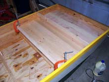 I kept the self-draining forward deck and motor well. It was framed with lumberyard boards, with the sides and bulkheads made from ¼ inch plywood, and the bottom made from 3/8’s. This resulted in a flimsy bottom, but the solution was fortuitous; longitudinal runners on the bottom, along with 2x2 framing on the inside gave me the rigidity I needed, and the bright-finished douglas fir runners look beautiful.