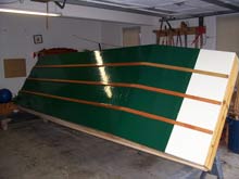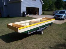First of all, this is not the Conestoga found in my plans. The basic idea is there, but with a number of changes. First of all, the beam is four feet, not five feet, and sleep-aboard capability was eliminated. Using a width the same as that of a sheet of plywood made the design much simpler. Also, I went with a more conventional powerplant. It moves along nicely with either my Minnkota 40lb. thrust tolling motor, or my 5HP Briggs and Stratton outboard. There should be room, however, if I ever want to try the gasoline-electric drive I proposed in the contest. In place of the foot well I placed in the sleeping cabin, I put a locker.