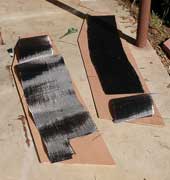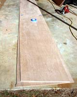 Designer Storer gives three options for the centerboard. Once is to use an old Laser board (and the mast and sail instead of the designed balanced lug). A second option is to laminate timber strips, which are planed to the designed thickness and then shaped into the centerboard. The third is to laminate plywood. Storer feels that the plywood version isn’t as strong as the timber strips, and so recommends a shorter board. I happened to have some scrap carbon fiber, nearly as thick as normal fiberglass woven roving. We decided to laminate that between plywood layers and make it the full length of the strip version. With the carbon reinforcing, we’ll tolerate no complaints about board strength! There’s enough scrap ply to get the three board layers from the six sheets specified to building materials. The catch is then there’s not quite enough to make the athwartship seat in the center of the boat. We got around that by butting two scraps together, lengthwise, and putting a layer of fiberglass tape on each side to get a piece big enough for the seat. It shows no weaknesses along the butt. |