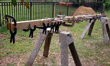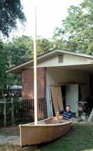 | The start of a very big day on the boat. The last two sides of the mast are glued on, proving again that no boatbuilder has ever had too many clamps. We would have liked a few more! The sides will be trimmed to size, the edges rounded and the bottom of the mast will be fiberglassed for abrasion resistence at the step and partners. Storer also recommends coating the entire mast with epoxy, which Olivier did. |