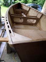 | The stern quarter knees are installed and it and the inwales are sanded smooth. The edges of the wales were also routed to round the edges. The stern seat/deck has been installed. |