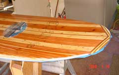 I had problems in the past with outgassing when laying up fiberglass cloth over wood with epoxy resin. In order to minimize this problem, the entire board was covered with a thin coat of epoxy (no cloth). Once set it was sanded smooth. The board was essentially sealed, so the cloth could be laid up without worrying about air bubbles from outgassing. It worked well. The bottom got one layer of 6 oz cloth and a fill coat; the top got two layers of cloth and a fill coat. Both top and bottom overlapped on the rails, so they essentially got 3 layers of glass – important since most dings occur on the rails.