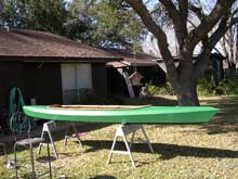 I'm expecting to recoat the bottom every time I've floated over any shoals but I'm expecting it to float in 4 inches of water without dragging. The dimensions, by the way, are: 36'' wide in the middle at the bottom; 44'' wide at the top; 23'' wide at the front; and 24'' wide at the back. The sides have a 15 degree rake and are 14 '' high. The boat weighs in about 200 lbs.