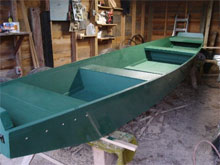 This is the first boat I have built. I got the plans, if you can call them that, from a book about ozark rivers. The book was "Rivers To Run" by Larry Dablemont, a Missori Ozarks  writer. The boat is yellow pine and marine ply for the bottom. I shall be using it on the lower buffalo river in arkansas and surrounding creeks. I don't plan to motorize it, mainly a downriver float boat....