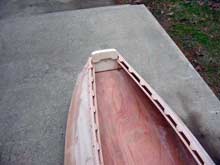 This is the inside of the boat showing the tracks for the seat (the oars have bronze tubes as counterweights - an idea I got from you). People laugh at my tractor seat, but it is really comfortable even after 5 hours of rowing. |