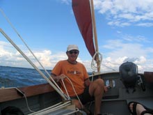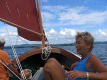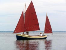 I am really looking to get to know her ways. I have to work out some rigging issues, the jib hangs up on the sprit boom, I haven't got a topping lift yet and hopefully that will help. I also have a big wrinkle in the sail from forward on the yard to the aft end of the boom. I'll experiment with different positions for the halyard on the yard.