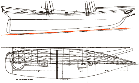 The first feature is the rocker of the keel. Before this, keels, even when they angled down, were straight. In fact, yards went to great lengths to get long timbers which either were straight or could be cut along the grain to be as straight as possible. It was thought, any sort of curvature would ruin steering. Here in a drawing of America I have put in a red line which shows the rocker of the keel aft and well forward. You can see the keel turn up.