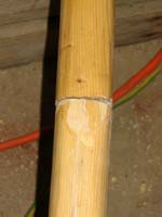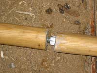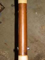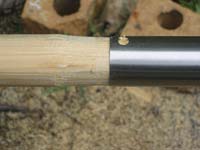 Clearly the better approach is to join the pole on the outside, so my second el cheapo approach was to simply use some of the copper pipe I had been using for end ferrules. The removable part is just bare wood, pinned in place with a ¼” bolt and nylon insert stop nut. I riveted the other side with brass rod, but that’s only because I was short a bolt and wanted it done.