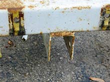 They probably should have done it this way from the beginning. They probably should have used some other gussets too. This frame has always twisted very noticeably. Here are two images with my dad putting the weight of one leg on one side of the rear of the frame, then the other.