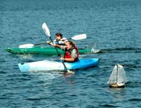 A Footy with audacity. An unusual impromptu contest (above) with a Bantam Boats Footy out to prove superiority over a pair of kayakers. I don’t know who took what is an excellent photo and I can’t tell you whether the tiny sailboat was successful, but hopefully some will enjoy the `all action’ photograph.