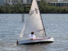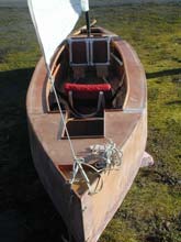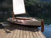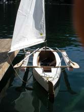 | My son enjoyed sailing the boat in Florida when I was there in 2007. Although it has been sailed with one crew onboard, it is pretty crowded and I just use it as a singlehander. It has a dagger/leeboard for lateral resistance and eventually ended up with a larger rudder for sailing, the originall being made more for steering while pedalling. The sprit boom is half of an old windsurfer boom. The oars are always in the oarlocks and ready to deploy. |