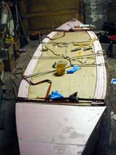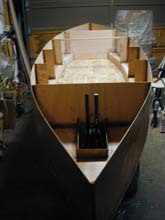 4" wide strips of 3mm ply were glassed in the cockpit to form storage bins and stiffen the 3mm hull sides. The Mirage drive well was inserted through the foam in the stern compartment with the idea of having a remote pedal system to leave the cockpit area open for sleeping. Since the boat draws only 3" to 4" the end compartments are self-draining. |