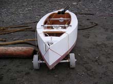 | The bare empty boat came out at just 55 lbs but is awkward to carry and had more weight added with equipment that is left in the boat. So I made a little beach dolly to help get it from the car to the water. The wheels are from a golf bag cart bought at a thrift store, and it comes apart to be carried onboard and stored in an end compartment. |