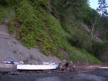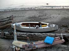 | Camping on the beach near Port Townsend, Washington. I removed the sponsons to make it easier to reach in for things. I slept in the boat rather than on the beach. At high tide in the middle of the night I was invaded by hundreds of sand fleas that landed in the boat and couldn't get out. I had to cover my head to get some sleep the rest of the night while they hopped all over me. The next time I camped here I slept on the sand. I've also slept aboard at anchor with my 2 kg. Bruce anchor. |