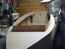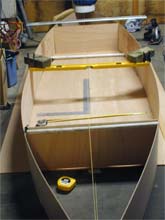 The first step was to cut the 16" high side pieces and connect them with butt blocks into full lengths. The ends were stitched together and the sides set up and spread apart with the two bulkheads. The bottom of the cockpit area was cut to fit the curve of the sides. |