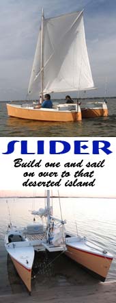 When I first thought about building Slider, the idea of selling plans seemed a little goofy to me. The reactions I’d gotten to my idea, from friends and in the various online boat-design forums were dubious at best, and among those critical reactions was one that struck me as possibly accurate: “Okay, so if, as you claim, a little cat with in-hull seating would be so easy to design, why hasn’t a real designer done it? Maybe it’s harder than it looks.”