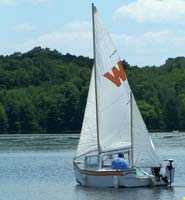 After sorting out the stuck, swing -down, off-center-board as well as the lee helm (see letter of .Oct 07’- Dec. DW) , I had about eight more sails that first year. As I wrote then to Chuck: “I cut it out and built a daggerboard .. roughly 2' x 3&1/2 ', same area. Doing so moved the center of resistance forward 6". Voila! a bit of weather helm .. light in light air, a bit more with a breeze ... just right.” Being able to tow up to the lake and sail with ease, keeping pace with a Potter 15, was a great confirmation of the concept. I haven’t any pictures from that period, but here are a couple in light air this past summer, at Lake Nockamixon, a sailing hot spot an hour north of Philly. There have been no changes to her rig or looks since, although I did add a 4“ bridge deck behind the cabin bulk head. There‘s a pulley and clam cleat for the main; she’s so steady that it’s entirely safe under 10 kts. It’s also cot two cup holders on either side and a 4” lip off the floor below which make a handy stowage for little things.
