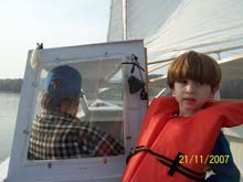 Happily, that first season extended well into Winter. Next are a couple of pictures from Thanksgiving week 07’ when my son was in from Oakland, CA. It was a beautiful, but calm day and a special pleasure to have my son, his son, and an old friend of his aboard. (You know you’re “old” yourself when your 44 year old son has an ‘old friend’.) This was the first time I was able sit in the cabin myself and appreciate the full headroom and panoramic view out all those windows. This is Lake Galena - Peace Valley Park, Bucks County, barely a half hour from home, a major lay-over for thousands of geese and ducks. There was just a wisp of air moving and we ghosted along for nearly an hour until it became still. The little electric trolling motor then got us in at maybe 3 knots on glass-like water at full power; 2 knots at ½ power. In light air the MinnKota and a large rudder provide ample control. A memorable day both for having the boys aboard, and for Nature’s exquisite beauty.