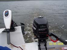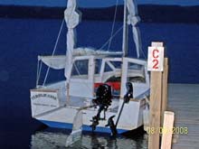 I contented myself with Duckworks reports, following the EC Challenge and chewing the fat with Steve through last Winter. The boat was covered with snow and ice several times with no apparent harm. The caps are off the compartments for circulation. The upgrade priority was to get a motor since in a breeze it was sometimes tricky getting in. And it would open up calm days and other waters; maybe some fishing outings too. The whole project was on a tight budget; using plastic was ruled out. I had saved up, and in May I bought a 07’ 3&½ Merc 4-stroke via Craig‘s List; nearly new, for $550. My total expenditure came to just under $2,000 over a year and a half - $900 or so on wood, epoxy, etc .. 500 on the trailer .. and the motor. My first outing this past Spring (08’) was a motor only trip to the north end of Nockamixon, varying the power often to begin to break it in. It’s at least eight miles long, plus a north inlet that’s more creek than lake that runs another couple miles too narrow to sail. I hadn’t had a motor since a pre-WWII 1&½ on a little pram in the mis-50’s. I wanted something that would protect the environment and allow me to get on to lakes with strict restrictions. The motor starts easily and put-puts along nicely at maybe 3 knots, just sipping gas at 1/3 throttle, opening lots more opportunities.