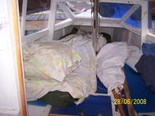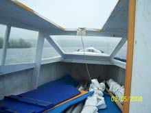 Sails laid inside - new dagger-board on the port cabin seat - anchor well forward. There are compartment under cabin seats and cockpit seats .. all kinds of room. |