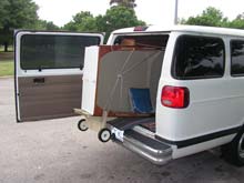 Roger shortened this boat to 12’ so it fits into the back of his long van, eliminating the need for a trailer. (Once it is all in, the rear door does close.) Once it is out, he sleeps in the van. |