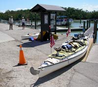| Stripbuilder and his lovely kayak at the Flamingo ramp. Note he has foam cushions under it to protect that stunning finish. |