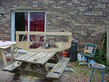 The picnic table/workbench where 4 Michalak boats have been built