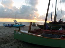 Several of us arrived on the shell beach and deployed anchors ashore before it was decided to relocate around a small point to the lee side. Perhaps 100 yards out and over and another 100 yards back. What could possibly go wrong?! Well, start by coiling up the anchor line on the fore deck of Embers Watch and carefully placing the anchor on top (so as to not scratch the new paint). Slowly sail away from the beach. Then notice VERY shallow water on the point and gybe in some haste to avoid it. Though the Mikesboat design has a relatively gentle gybe, she still rocks a bit. Now watch the anchor slide off the foredeck and sail away from it – for a short distance… As the anchor rode snubs up and almost stops forward motion, the bow is hauled around. The mainsail, whose sheet was released as the anchor set it taken aback and another gybe ensues, this one not gentle at all. I am almost thrown off the foredeck where I was trying to haul in the errant anchor. When it is finally stowed away properly and we are sailing again, Paul says “That was horrible!”….. I don’t know how many saw this and refrained from mentioning it, but rest assured Embers Watch will soon have a draining anchor well in the bow. Lesson learned!