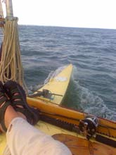 Finally making some miles. Heading southeast down Core Sound toward Cape Lookout. A squall came up and everyone had to heave to for an hour or so, then sailed on the remaining wind down toward the night's camp at Cape Lookout. Paul says it is a wonderful spot and they make decide to have a layover day here next year.