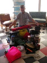 I would be taking my Jim Michalak designed Imresboat and I wanted to report to Jim about the boat so I had Sandra take this picture of me with all the gear I would stuff into the poor thing. The biggest item was water (pink bags in front) which weighed 50 pounds. In addition, there were, in no particular order, a toilet (required in the park), food, cook stove, tent, sleeping bag (it got down to 35 F one night), sunscreen, sun hat (it got up to 95 F one day), life jacket, folding chair, and epoxy repair kit (more on that later).