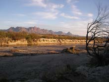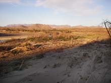| After dinner I hiked around a bit. I was amazed at the extent of the recent flooding. This picture shows what was once a patch of cane which normally grows high along the river but which has been scrubbed almost clean. If you click the picture to enlarge it, you can see the river way below. The interesting thing is that most of the flood water came out of Mexico, entering the Rio Grande just above Big Bend via the Rio Concho at Presidio. |