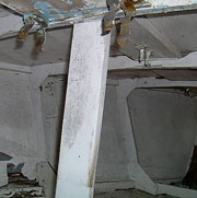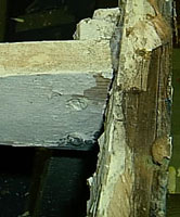 The partners had been cut short, a piece of 3/4 pine screwed to the end and the whole screwed with substandard sized wood screws to beams without glue or bedding—this came out in my hand…