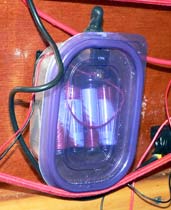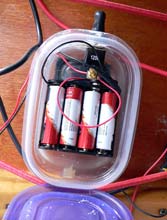 | A low-cost, water-tight food storage container makes a good fit for for 8 AA batteries to power a red LED light for the compass. If the switch, wire connections, and box stay watertight, this system would run underwater! |
