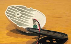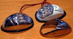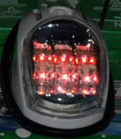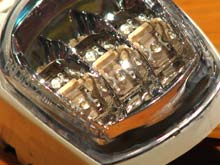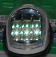 Each light uses 6 LEDs pre-mounted in a permanently sealed plastic assembly. There is a complex chrome-coated reflecting assembly behind and around the LEDs. I assume it is because of the expected long life (perhaps 50,000 hours—over 10 years of every-night use!) that the designers chose a permanently sealed assembly. That avoids the corrosion and poor contact problems that plague low-voltage devices such as flashlights. The LEDs emit only green (or red) and look clear when shut off.
