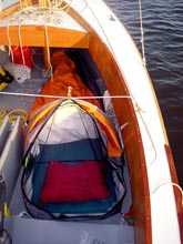 This was my fourth cruise on Spartina. Each and every journey has added to my confidence in the Pathfinder's ability. I find what I need in an open boat - comfort and safety. Food and gear were stowed away for a six day trip. Eight gallons of water hid under the bunk flat, crackers, canned fruit, packets of tuna and rice taking up just a tiny bit of the space under the thwart. A two burner stove, bivy sac and boom tent for sleeping were secured by bungee cords. Safety gear, fishing tackle and a stack of good books were all tucked out of the way. What more could I need?