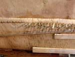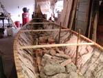 How the ribs are laid on top of sheathing and beveled underneath inwale. The gunwale cap is visible as well. |